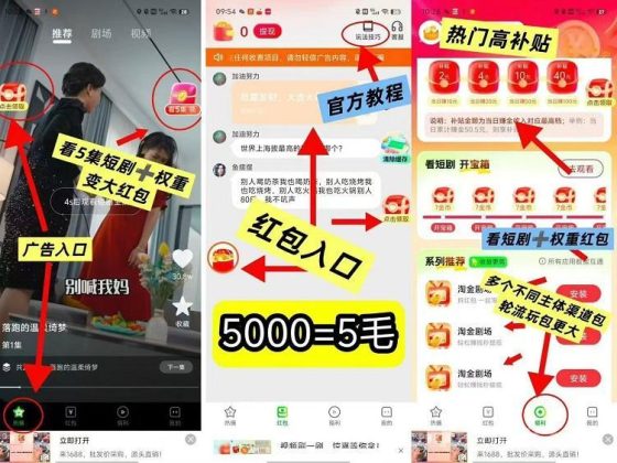 ①App内红包页面右上角有玩法教程,新人福袋七日必得200000金币,可以通过观看广告或热播短剧,领取各种任务和红包