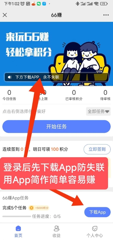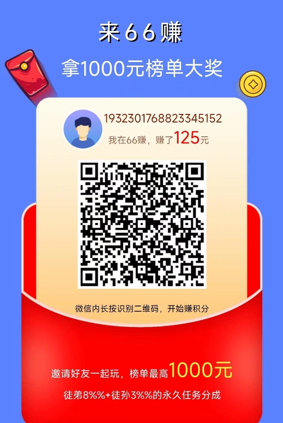 在微信上扫码注册并登录66赚平台。注册后,将平台页面收藏到微信,方便日后直接进入。也可以下载66赚APP,一些任务在微信端操作更便捷。如果担心微信屏蔽平台入口,安卓用户可以下载APP并保存。