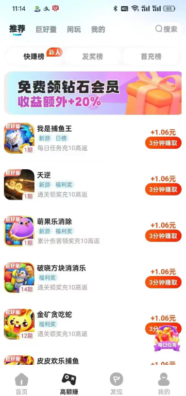 每天登录玩消消乐这类小游戏就行。开启自动模式轻松过关,不需要复杂操作。每个游戏试玩完成最低赚1.06元,收益实时到账。适合利用碎片时间赚零花钱。