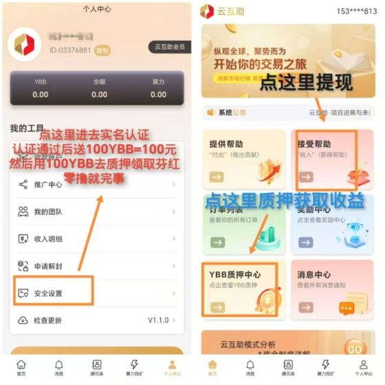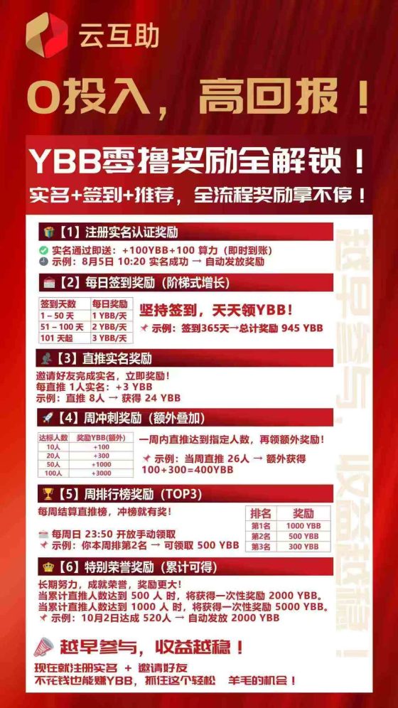 云互助是全新上线的首码项目。注册实名认证直接送100元YBB代币。用赠送的代币参与质押获得分红收益,最高收益率达12%。全程零撸无需投资,七天一个周期返还本金利息。