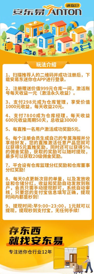 安易东迷你仓是全新上线的挂机赚钱项目。注册即送价值999元迷你仓库一间,激活账号后每天稳定收益2元,享受永久收益。玩家之间自动交易,官方承诺回收保障,挂机操作简单易懂。