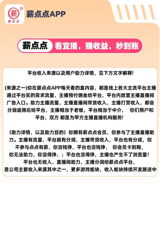 薪点点零撸采用看客帮模式,用户观看直播即可获得点券,点券按10点券=1元比例直接折算为平台币,平台设定保底收益,确保每日收入不低于预期。