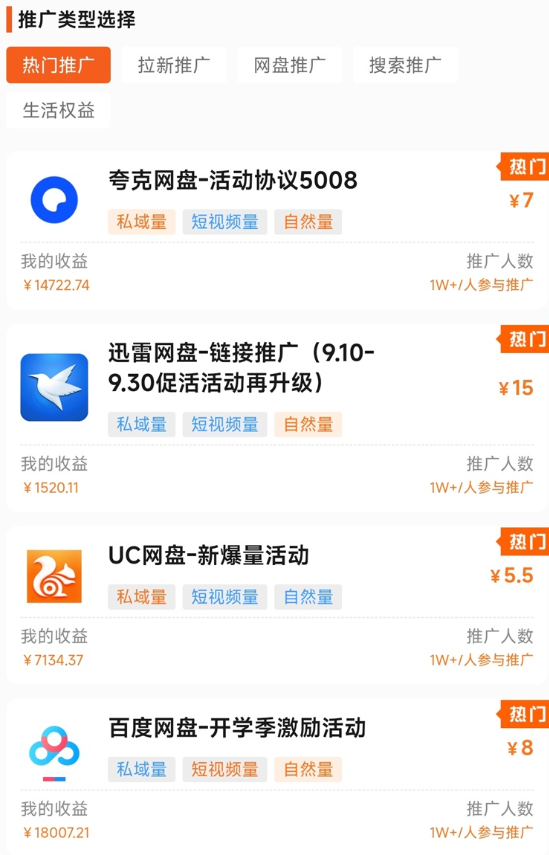 网盘拉新项目的核心收益方式,拉新奖励,蜂小推注册邀请码37554040,每成功邀请一个新用户下载,就能拿到佣金,不同平台给的佣金不一样,现在夸克给的佣金最高,拉一个新用户能赚10块钱;百度网盘大概7块;UC和迅雷这些差不多5-8块钱。