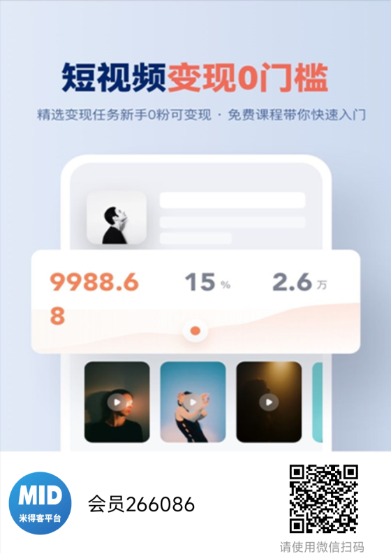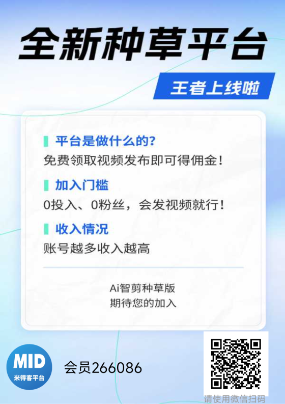 米得客是全新上线的视频种草平台,用户免费领取视频发布即可获得佣金,零门槛零投入无需粉丝,会发视频就能赚钱。