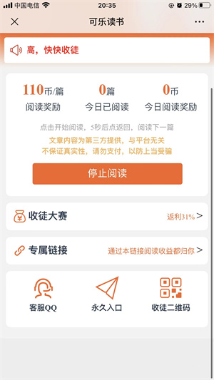 保存二维码用微信扫码进入,点击开始阅读后复制链接到微信聊天窗口打开,自动阅读5秒一篇循环赚钱。