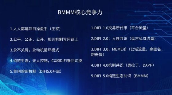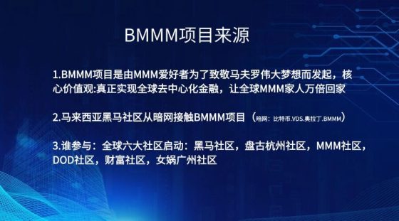 1.BMMM项目是由MMM爱好者为了致敬马夫罗伟大梦想而发起,核心价值观:真正实现全球去中心化金融,让全球MMM家人万倍回家