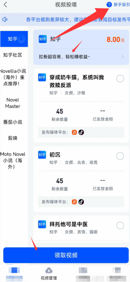 这里说一下收益问题,并不是发了视频就有钱拿,是要有效转化了才有收益,例如,你是要推广知乎,那么你发的视频,有人通过你视频完成有效转化了你才有钱拿。