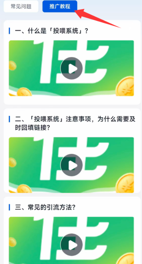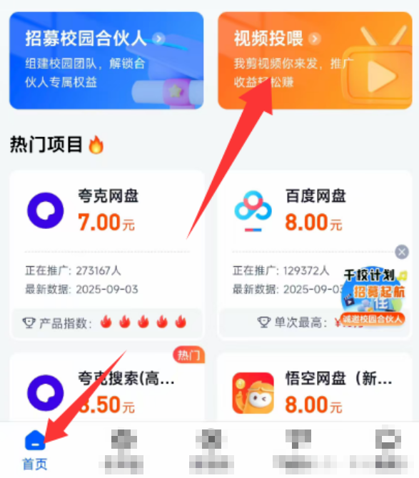 然后在首页,中间右侧,有个视频投喂,这个板块就是视频代发,其他的板块我们暂时都用不上,以后有机会再给大家讲其他板块怎么玩。