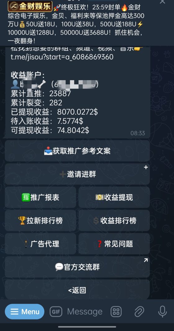 飞机上最火的两款搜索机器人,邀请搜索赚取收益,虽然不能让你暴富,但是用来补贴家用却绰绰有余(注:有飞机账号的可做),好啦!废话不多说,直接进正题: