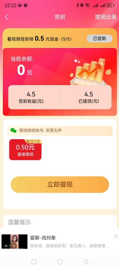 每个广告收益明确0.1元。保底任务确保基础收入。双平台互补提升收益稳定性。操作简单新手快速上手。