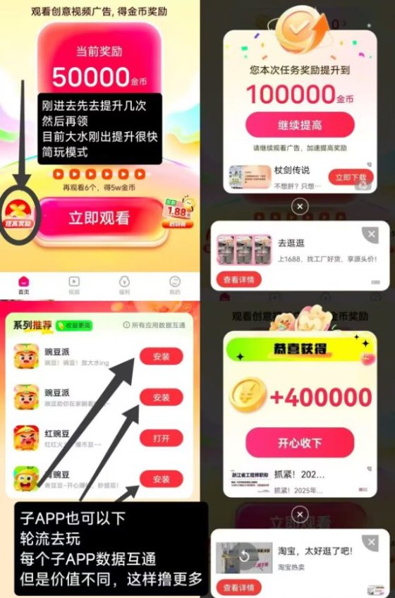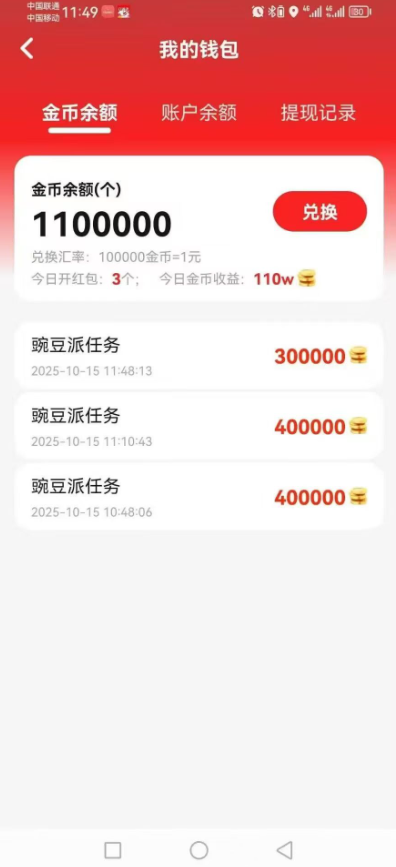 在豌豆派首页找到任务,观看6个创意视频广告,就能获得丰厚的金币奖励。有机会体验到天降红包的惊喜。在这个过程中,完成任务还能开启新任务,保持收益不断。