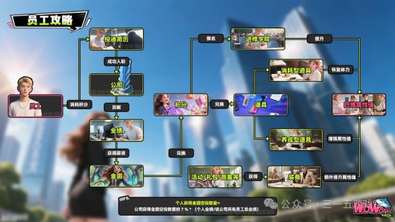 在《wowork》中,玩家每日签到并投递简历即可获得金园积分。在游戏中,打工不仅仅是为了增加收入,还能提升各项属性,进而提高工作效率和收益。