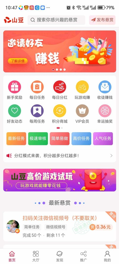 山豆米米是一个创新的悬赏平台。用户通过完成各种任务,不仅能获得现金奖励,还能积累积分。这些积分可以用于每日分红,让收益更加丰厚。