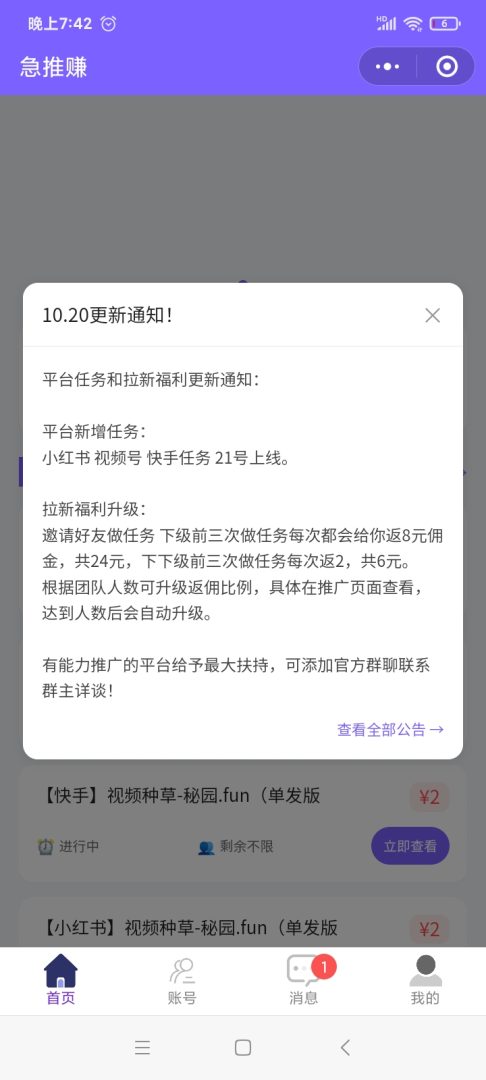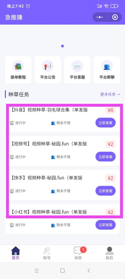 每个账号每四小时可以接一次任务,审核通过后会发放保底佣金。此外,每条发布的视频都根据播放量给予额外奖励,这不仅促进了用户积极性,也使得视频内容更加丰富。