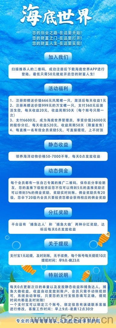 海底世界打开后直接进入登录页,使用手机号或微信完成注册即获价值666元的凤尾螺,凤尾螺每天自动产生约10元收益,连续签到七天系统额外赠送万宝螺,万宝螺每日产出约20元,收益实时计入账户,余额满1元即可点击提现按钮,资金秒转至支付宝或微信,提现无手续费。