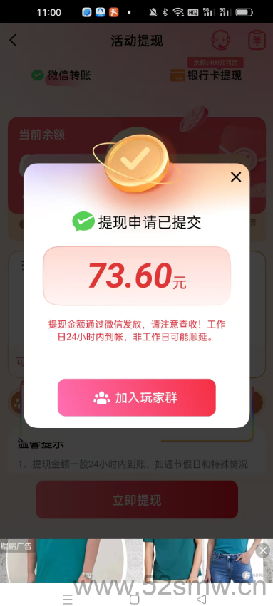 平台每观看六个广告即可获得0.7元至5元不等的奖励,单个广告最低返0.1元,累计达到1元后点击提现按钮,系统在几秒钟内将金额转入绑定的微信钱包,提现全程免费。