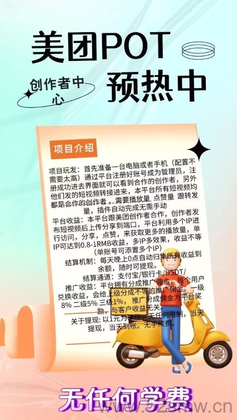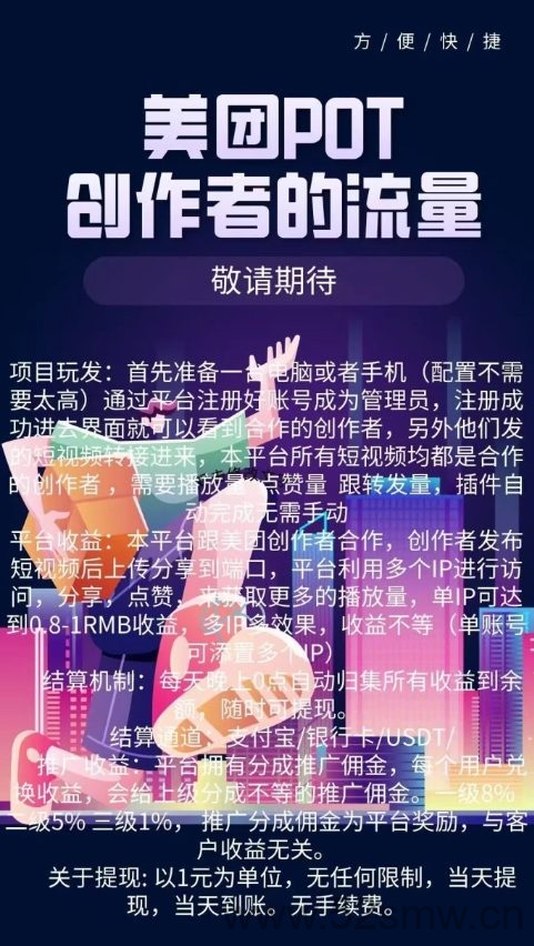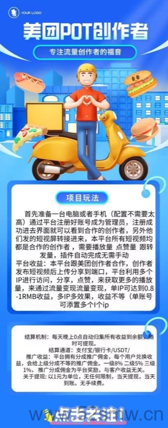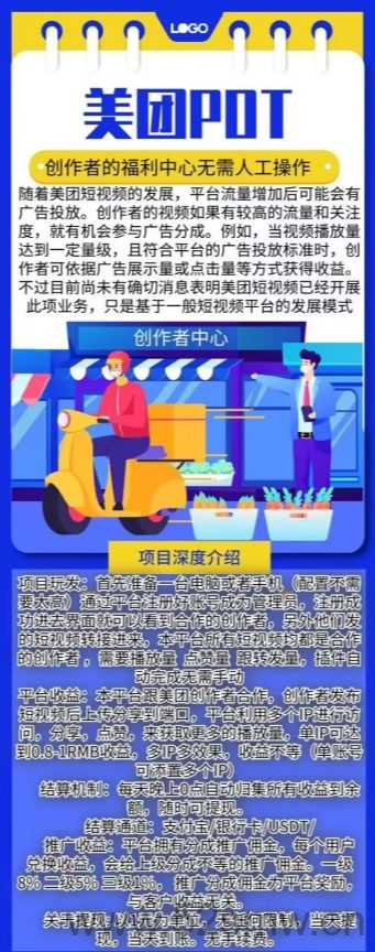 平台收溢:本平台跟美团创作者合作,创作者发布短视频后上传分享到端口,平台利用多个IP进行访问,分享,点赞,来获取更/多的播放量,単IP可达到0.8-1RMB收溢,多IP多效果,收溢不等(単仗号可添置多个IP)