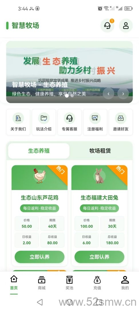 智慧牧场打开后直接进入首页,注册成功即送价值888元的原生态产品,激活账户后系统每天自动发放约20元收益,累计1元即可点击提现按钮,金额秒转入绑定的支付宝,整个过程免费且无节假日限制。