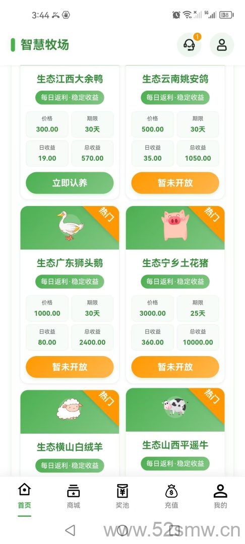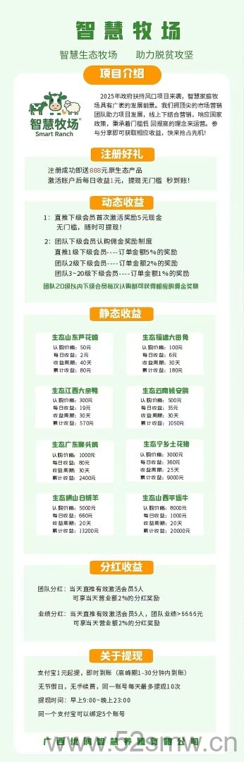 平台提供多种生态养殖项目,山东芦花鸡每日约2元,福建大田兔每日约6元,江西大余鸭每日约19元,云南姚安鸽每日约35元,广东狮头鹅每日约19元,宁乡土花猪每日约360元,山西平遥牛每日约660元。每周平台还会额外发放分红,提升整体收益。