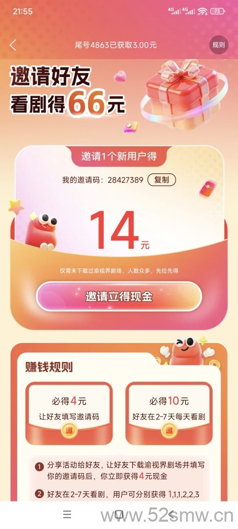 分享专属邀请码邀请新用户下载并注册,邀请人立即获得4元奖励,邀请越多奖励越高,奖励自动到账无需额外操作。