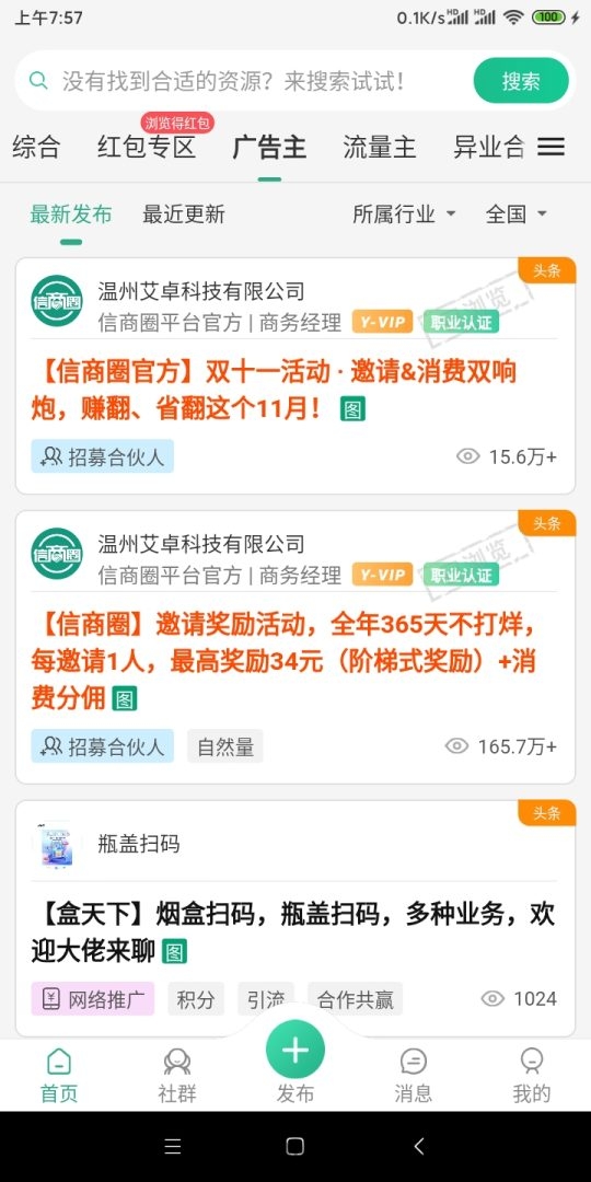 信商圈打开后直接进入发布页,填写项目标题、简介、联系方式后点击发布,系统立即上线广告,浏览量自动累计,注册用户每产生一次有效报名即可获得平台币,1000平台币可兑换1元,累计0.5元即可点击提现按钮,金额秒转入绑定的微信或支付宝,过程免费无手续费。