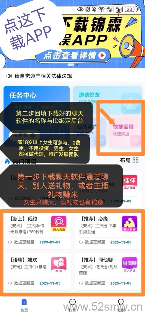 女用户可以作为聊天员,也能做代理进行推广。平均每天,一名女生的收入可以达到100到500元。而作为代理的男生,只需招募几名女生聊天,就能实现每日额外收入。这个项目为有意愿的用户提供了一个零投资、灵活赚钱的机会,通过扫码注册和团队推广,轻松实现月入过万的目标。