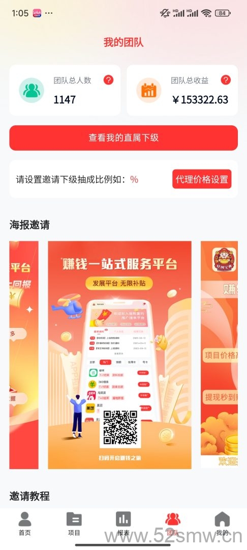 除了丰富的项目资源,轻创宝典还有很多贴心的功能。在 “我的团队” 板块,你可以清楚地看到团队总人数和团队总收益。要是你发展了自己的团队,还能设置邀请下级的抽成比例,躺着就能赚钱!小编经营一个月团队总人数目前已经有达到了1147人,团队总收益达到了 153322元,这数据相当亮眼,也证明了这个平台的潜力。