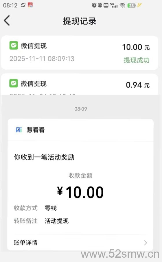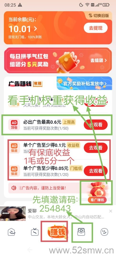 在慧看看,用户可以选择观看20个保底1毛或20个保底0.5毛的广告,这样的设置确保了每位用户都能获得稳定的收入。对于手机权重较高的用户,甚至可以观看50多个广告,从而赚取更多的收益。