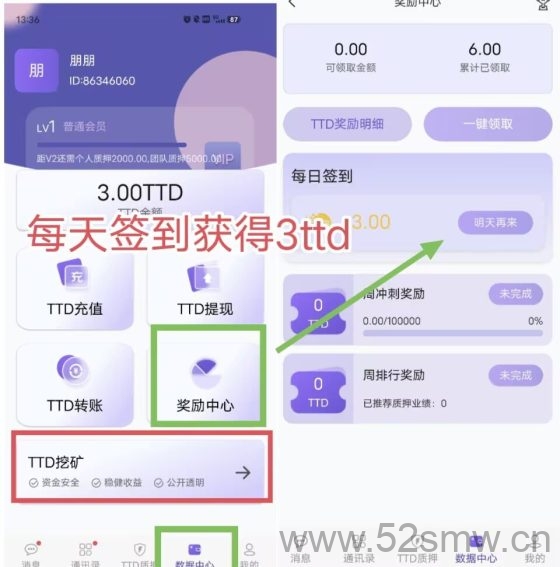 用户每天可签到领取3个TTD,相当于3元人民币。通过数据中心启动TTD挖矿,收益不仅可以质押,还能随时变现。推荐好友加入,每成功推荐一人可获得10算力,团队无限代推荐每新增一人也能获得5算力的奖励。