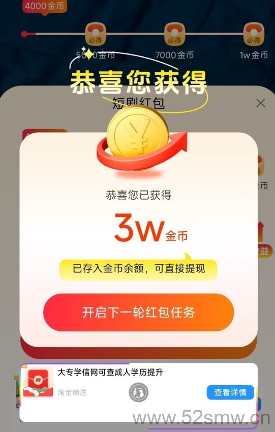 迁果剧场(迁果短剧)是一个老字号平台,平台有个看广告得金币的活动,攒够一定的金币就可以提现,有大神一天看了200多个广告,直接撸了七八十,比较适合平时没啥事情的人做。