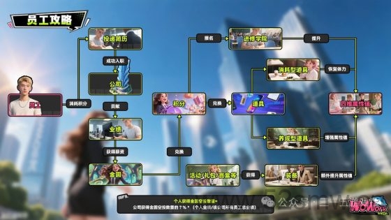 体力决定打工时长,健康提升非打工状态下体力恢复速度,执行力直接关联每日业绩,领导力影响公司收益分配比例。经验点达到100点后四维属性上限提升1点,整体收益随属性提升而增长。
