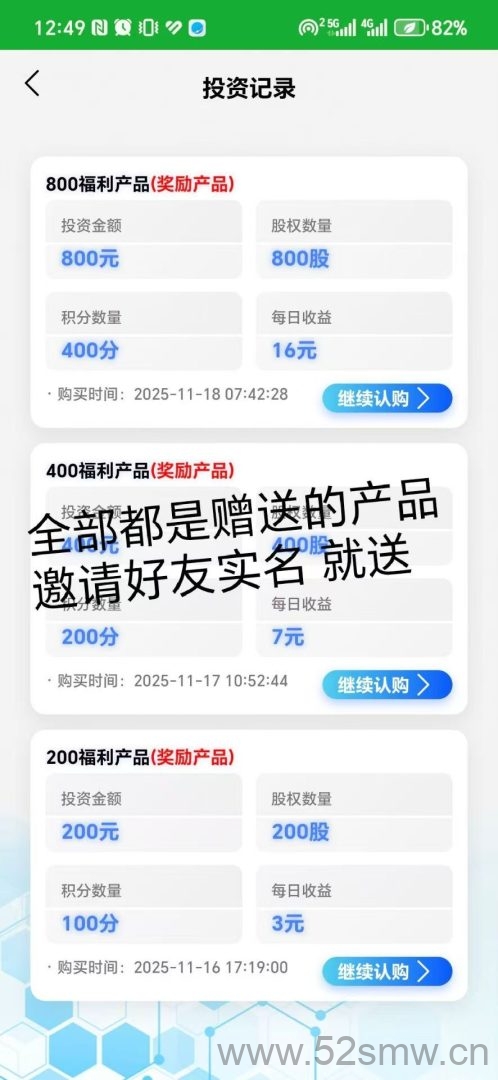 2:邀请8名好友实名注册奖励一套价值800元的股权产品一份 股权数量800 积分数量 400 抽奖次数 3次 每日收益16 元