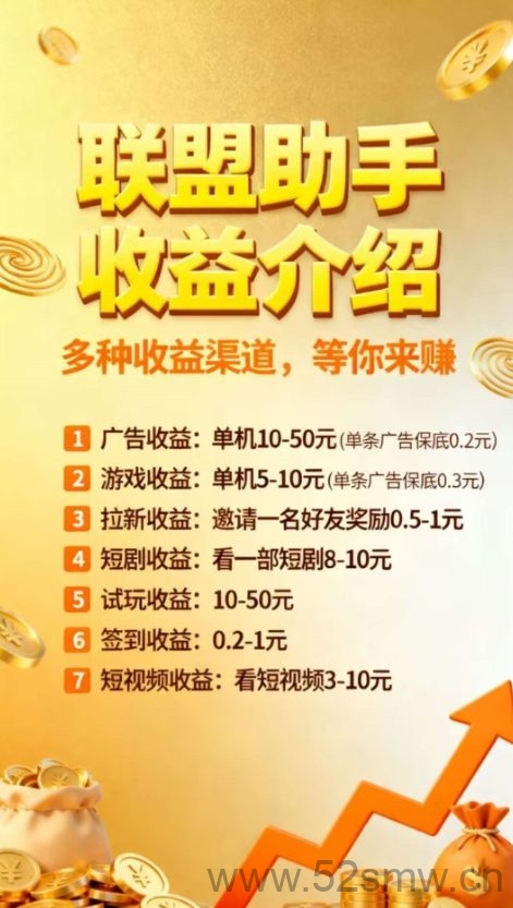 联盟助手首码预热单机收益高项目直接打开即可看到任务列表,完成系统分配的高单价广告即获得现金奖励,单机日收入在40元到80元之间,累计1元即可申请提现,秒到账微信或支付宝,完全免费。