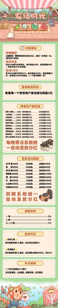 用户再注册后可领取999元的额外奖励,下单328元后,每天有20元的固定收益。而且加入6688元果园管家服务后,可以每天提取高达500元的收益。最低下单30元即可激活账户,胡萝卜的日收益为2元,而100土豆的日收益更是达到了5元,500黄瓜则能带来31元的稳定回报。