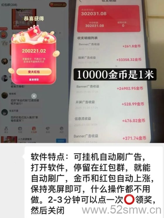 星瀚启点(星瀚生活)软件特点,可半自动挂机自动刷广告,打开软件,停留在红包群,就能自动刷广,金币和红包自动上涨,保持亮屏即可,什么操作都不用做。2-3分钟可以点一次O领奖,然后关闭,就会有插屏副广收益。