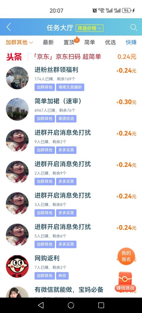 用户进入任务大厅后,可在左上角选择分类,找到“加群”选项即可。所有任务都是简单易行的加群活动,让任何人都能参与其中,无需复杂技巧。