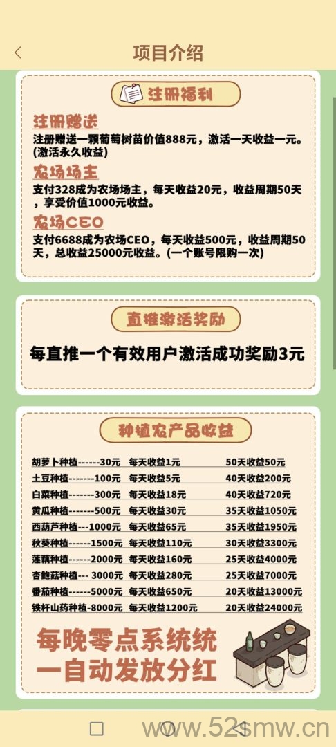 首码时光农场刚刚上线,抓紧机会进入。这个项目不需要任何投资就能推广赚钱,也可以通过投资动物来获取收益。平台提供丰富的养殖选择,既有山东芦花鸡,每天可赚约2元;还有福建大田兔,日收益6元;江西大余鸭,收益达到19元;云南姚安鸽更是高达35元;广东狮头鹅和宁乡土花猪的收益也分别为19元和360元。用户能够根据自己的需求和目标,灵活选择不同的养殖组合。