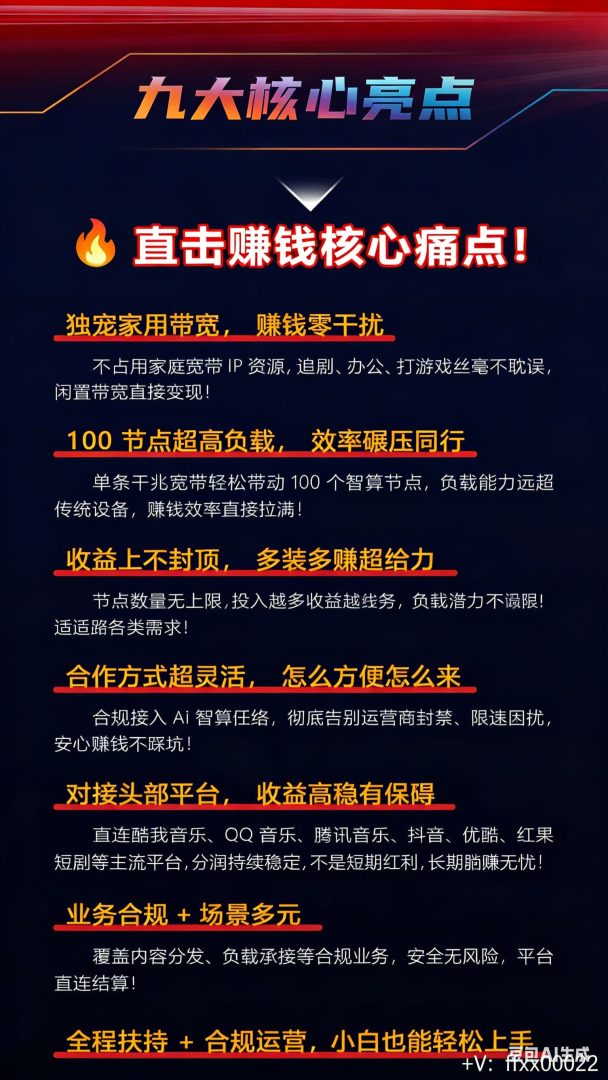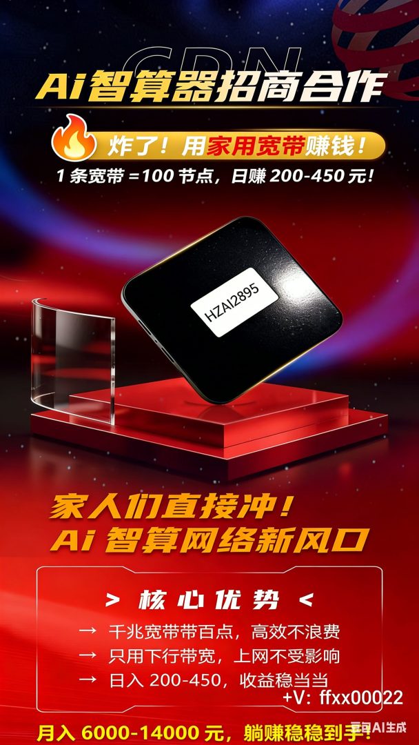 但现在,你只需要家里有一条1000M宽带,我们提供设备、上门安装、全程技术指导。闲置的上行带宽,每天都能产生3-4元稳定收益——钱不多,但可持续、能累积,而且完全合法合规。