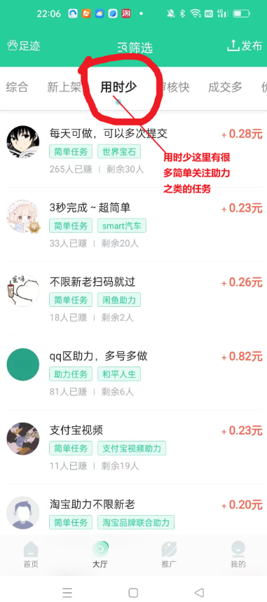 在任务板块选择《用时少》类别,你会发现大量关注、点赞和助力的任务。这些任务设置简单,非常适合利用碎片时间进行操作,赚取的收入足以支撑你每天的小奢侈,比如喝杯奶茶。