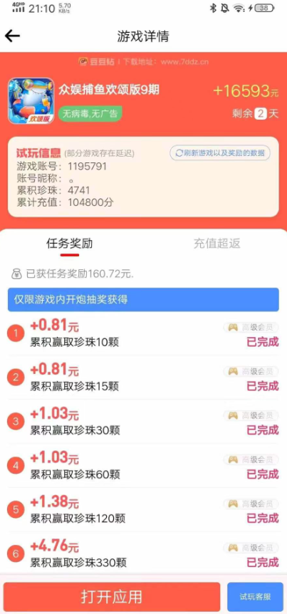 5、领取奖励:按试玩要求参与游戏,返回豆豆钻游戏详情页,查看奖励是否“已领取”