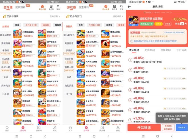 2、开始任务:选择游戏进入详情页,查看试玩范围及游戏任务奖励,点击“开始赚钱”下载游戏