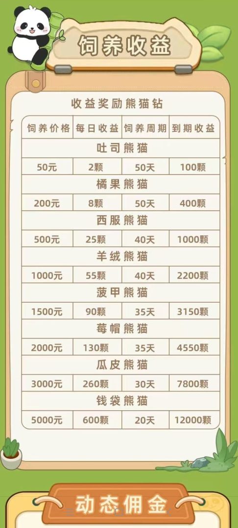 不同熊猫对应不同日产钻石数量,从基础熊猫到高阶熊猫每天稳定释放钻石,所有收益都支持当天兑换提现,产出节奏清晰,不存在延迟结算。