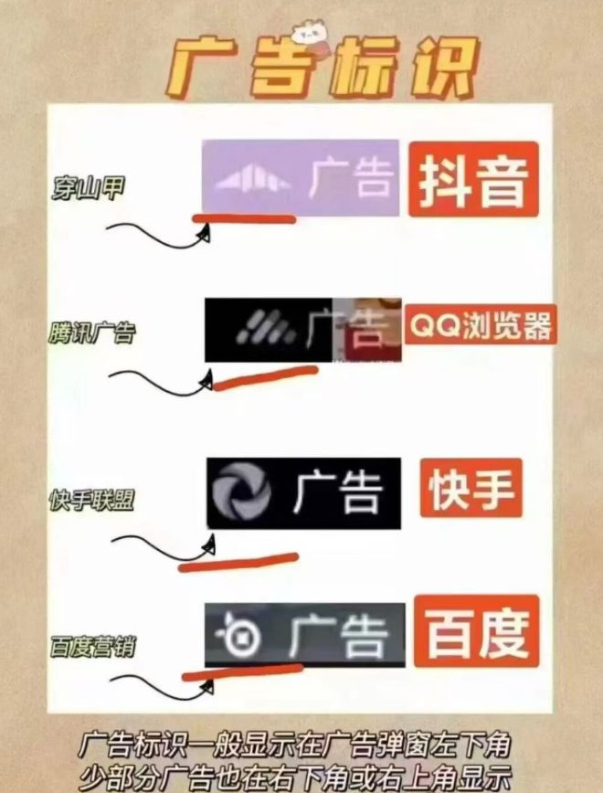 同时看一下我画圆圈的位置,注意看每个广告的角标标志,不同角标代表广告商不同,则每一个广告的收益也不同,大致就分为一下几种,按照大致权重排的序