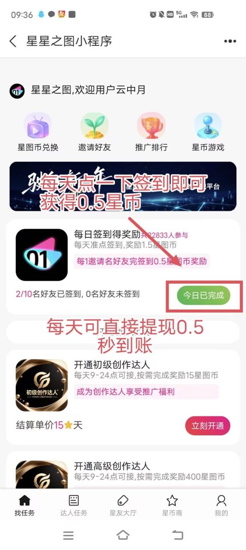 拉人进来有额外进账,下级每天签到你抽0.5星币。这个收益有天花板,每天最多拿5星币,也就是10个活跃下级就封顶了。适合小范围裂变,不用疯狂拉人头。平台刚上线,提现通道还顺畅,建议先单号测试到账速度,确认没问题再铺号铺团队。零成本零门槛,薅多少算多少。