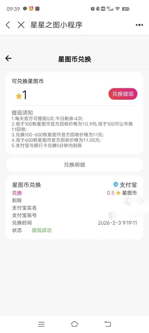 每天签到0.5星币,换算下来0.45元秒到支付宝,没有手续费。流程极简,打开点签到,提现选支付宝,钱立马到账。单号每天就这一下,耗时不到半分钟。想多赚就开多号,家里闲置手机全挂上,五个号就是两块二,十个号四块五,纯被动收入不用管。