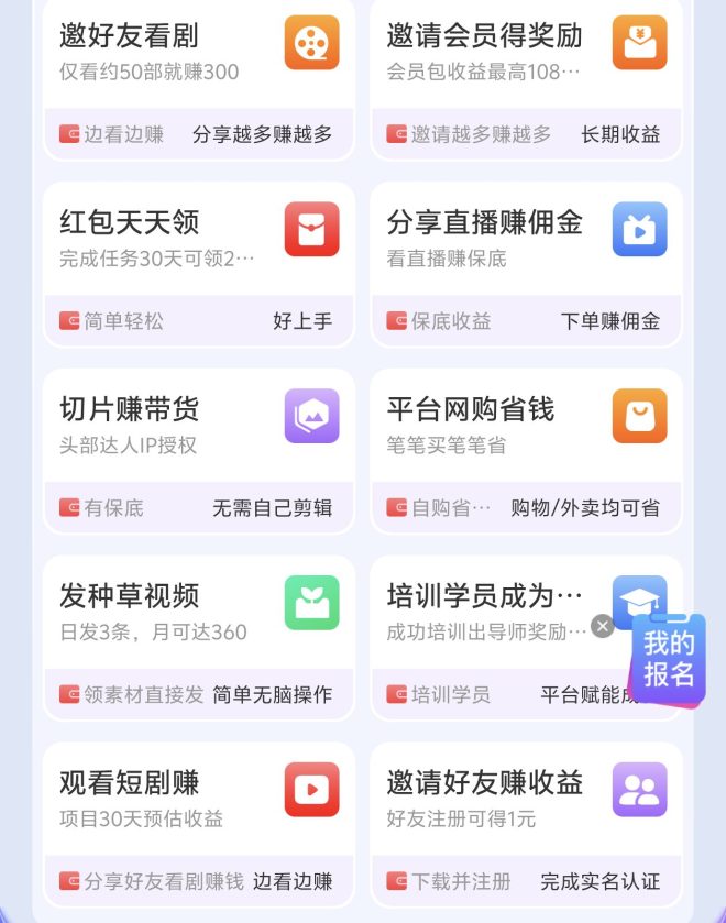 观看短剧内容并解锁广告章节,按有效播放和完播率结算。该板块适合 leisure time 较多的用户,将娱乐行为转化为实际收益。