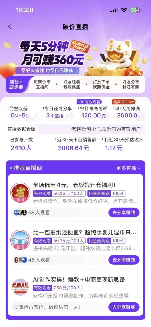 直播专区就是一些挂有小黄车的带货直播间,进去看几十秒会弹一个优惠券,有用得上的自己也可以买。你也可以分享直播间,你或好友观看满5分钟,可以获得直播收益;你或好友在直播间下单,均可获得返利收益。