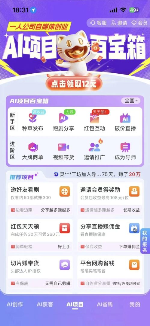 然后就是点AI项目那里,最上方有个AI项目百宝箱,点进去,里面是新手任务,应该是普通会员6元,开通超级会员12元,一天就差不多能回本。