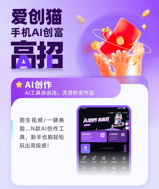 爱创猫视频种草平台,每天发3次视频,AI种草发视频奖励3元/条,还有ai带货,分享直播赚,看广告等等小任务,根本挣得停不下来,满2起提米,快来加入试试吧。