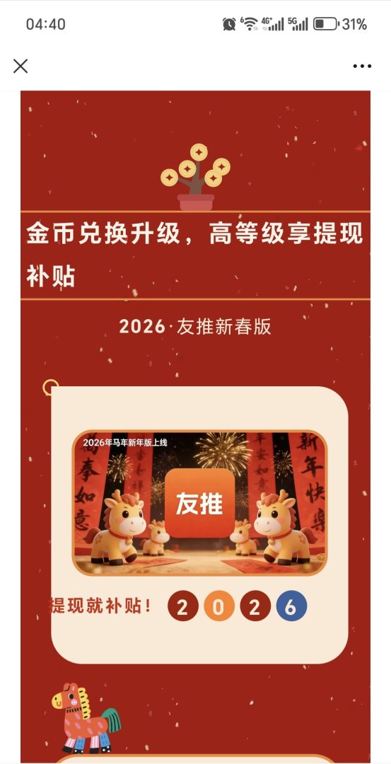 友推新春版正式上线,主打每日抽取苹果17Pro及百万现金红包福利,叠加提现等级补贴机制,新用户注册即享5次高爆率抽奖机会,实测单日最高提现388元现金。